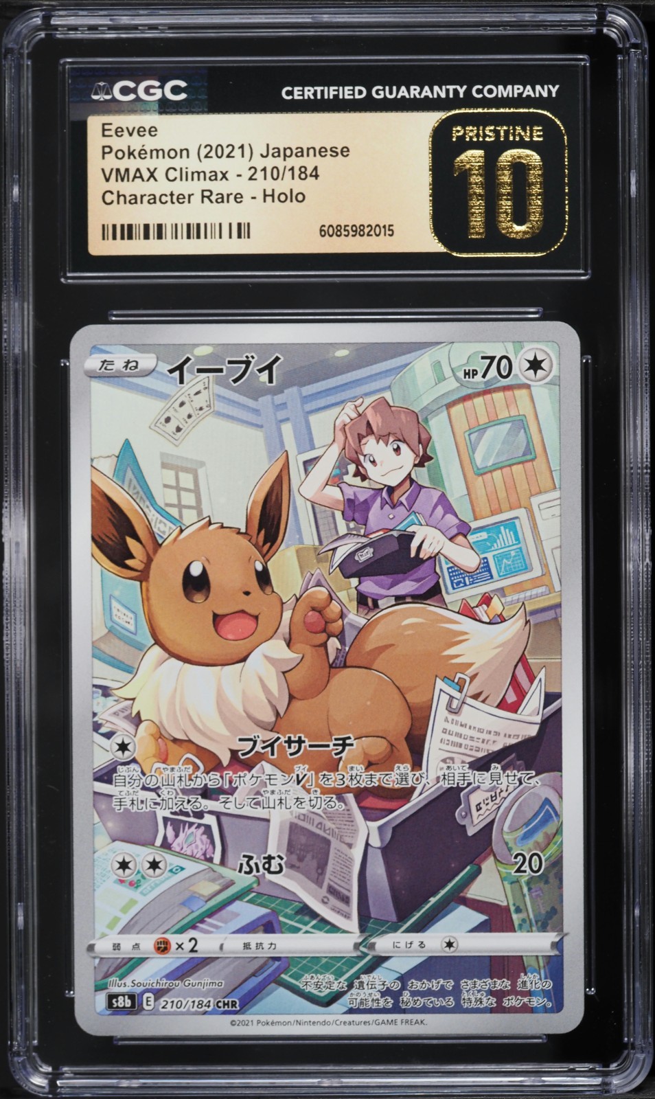 The product is a 2021 #210 Full Art Eevee CGC 10 Pristine Japanese Sword & Shield Vmax Climax card from the Pokémon TCG franchise. This card features the character Eevee with a HP of 70, part of the VMAX specialty from the S8b set. Manufactured by The Pokémon Company, this Pokémon card has a holo finish and is considered character rare, with alternative art and altered/custom art features. A highly sought-after collectible for fans of the Pokémon series, this card is a valuable addition to any card collection.