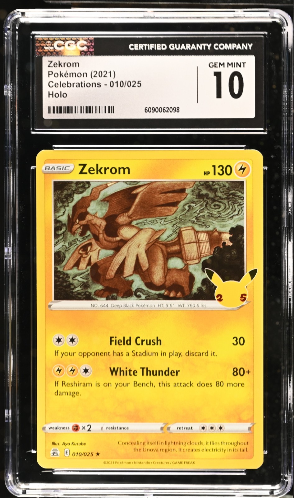 The product is a 2021 Pokémon Celebrations #010 Zekrom card graded as CGC 10. This collectible card features the Pokémon character Zekrom, with a holo rare finish. It is part of the Pokémon TCG game, in English language and illustrated by Aya Kusube. The card is manufactured by The Pokémon Company and has an HP of 130, making it a sought-after item for collectors and players alike.