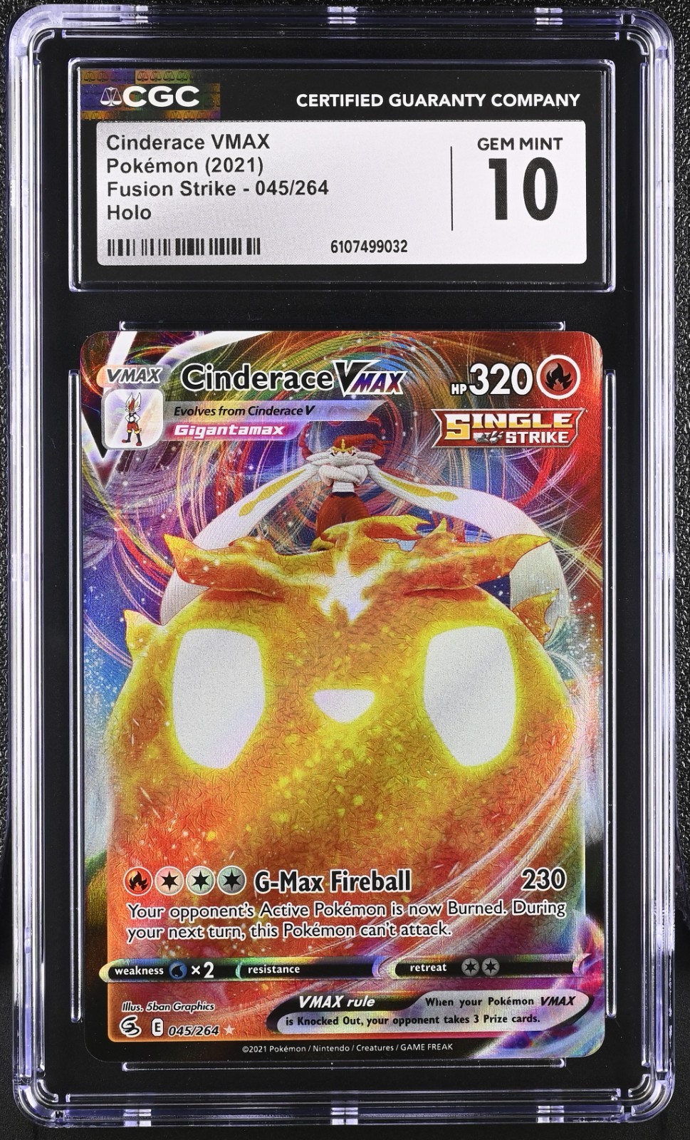 The product is a 2021 Pokemon Sword & Shield Fusion Strike #045 Full Art/Cinderace VMAX card graded CGC 10. This collectible card features the character Cinderace with a high HP of 320, manufactured by The Pokemon Company for the Pokemon TCG game. The full art design and holo finish make it a sought-after addition for collectors and fans of the franchise. This English-language card is a valuable addition to any Pokemon card collection.