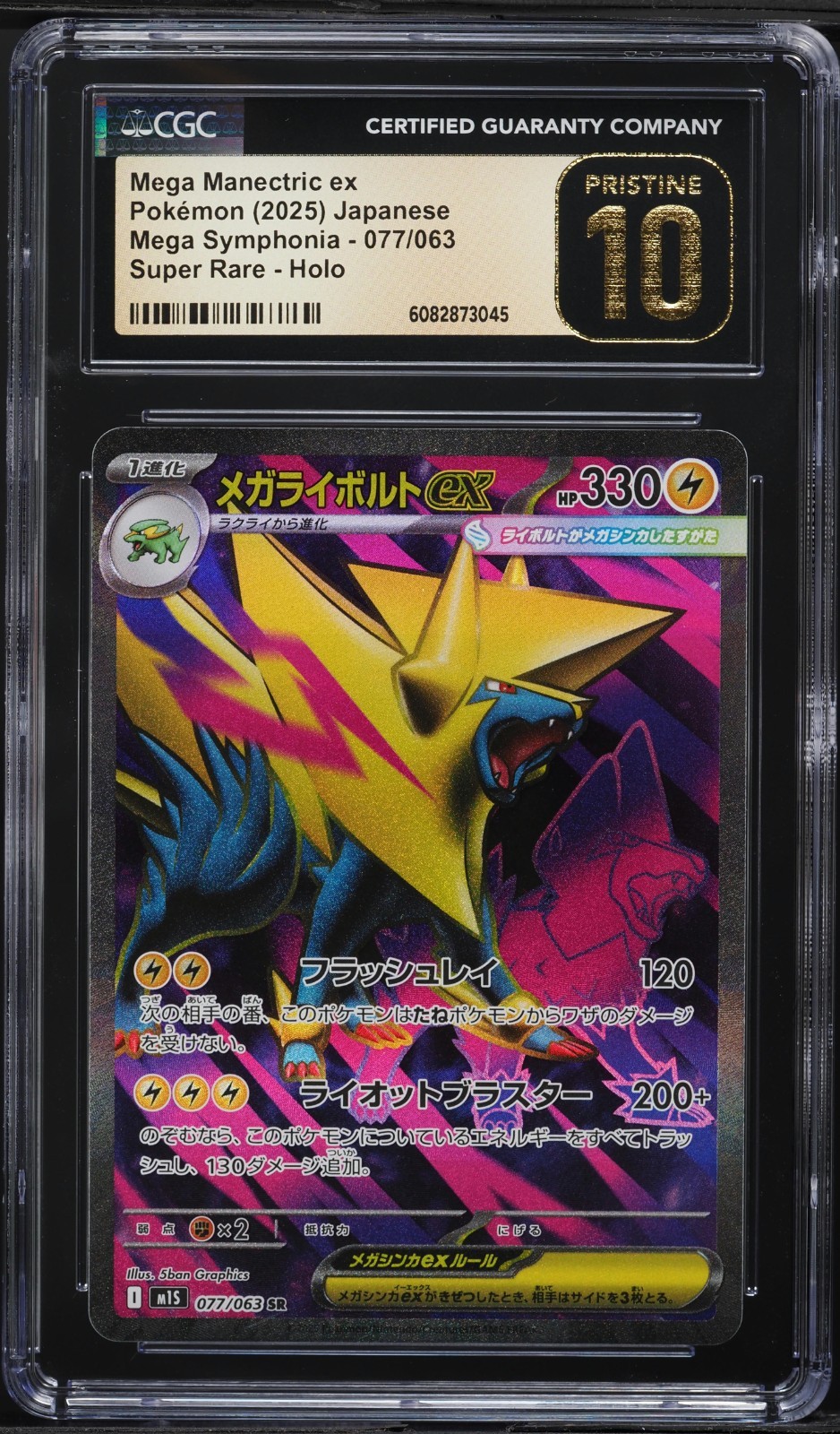 The product is a 2025 #77 Mega Manectric ex Pokemon card from the Japanese Mega Symphonia set, featuring a Stage 1 Lightning attribute with 330 HP. This collectible card game item is part of the Pokemon TCG series and is a Super Rare Holo Full Art card with a special EX designation. It is autographed by the illustrator, 5ban Graphics, and authenticated by Professional Sports Authenticator (PSA). This card is a valuable addition to any Pokemon card collection, with its unique design and rarity making it a sought-after item for fans and collectors alike.