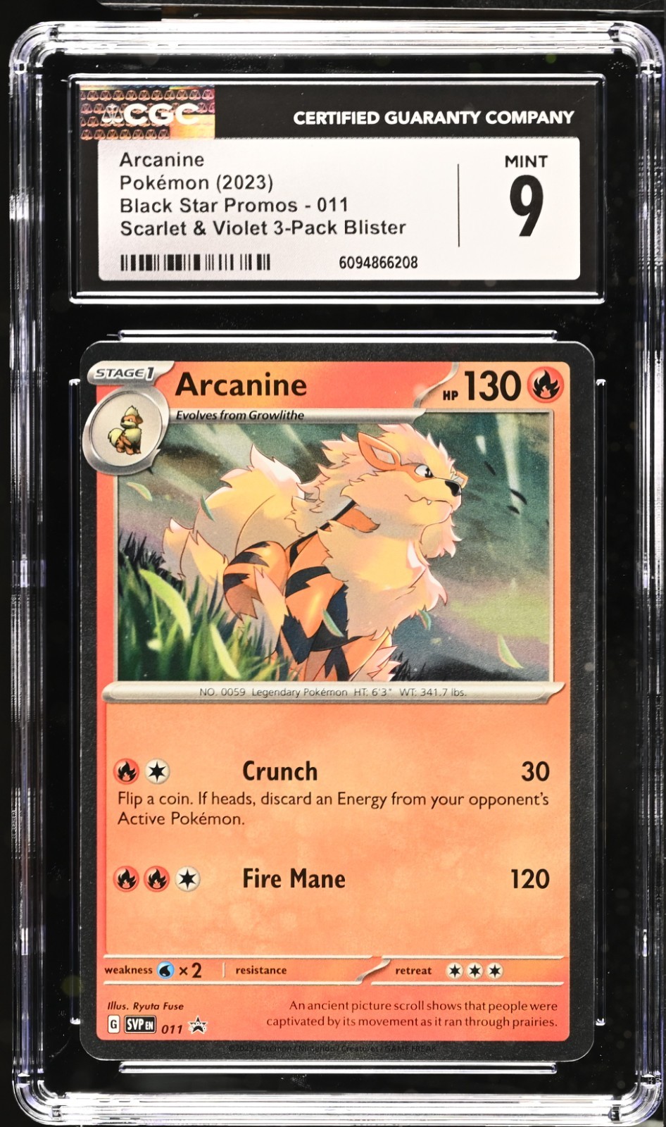 The Arcanine Black Star Promo card, released in 2023 as part of the Pokémon SVP Scarlet & Violet set, features a fiery Fire attribute with a high HP of 130. This Standard-sized card, illustrated by Ryuta Fuse, is a Stage 1 Pokémon card manufactured by The Pokémon Company in the United States. The Holo finish and promotional aspects make it a desirable collectible for Pokémon TCG enthusiasts, showcasing the iconic Arcanine character in a unique and limited edition design.