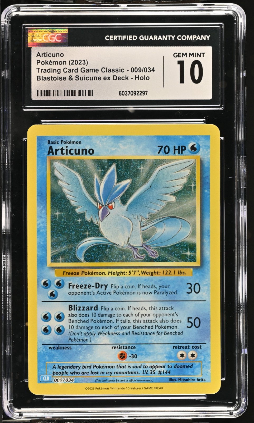 The product is a CGC 10 GEM MINT Articuno 009/034 CLB Classic Box Holo Rare Pokémon TCG card from the 2023 Pokémon League event. This special edition card features the ancient bird creature type with 70 HP and a holo finish, illustrated by Mitsuhiro Arita. Graded by Certified Guaranty Company (CGC) as a perfect 10, this English-language card is a highly sought-after collectible for Pokémon TCG enthusiasts, showcasing the iconic Articuno character in a classic box design.