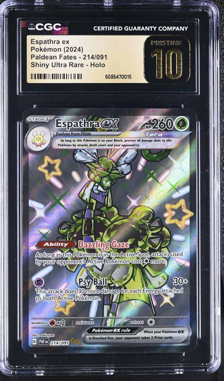 The product is a rare and highly sought-after ESPEATHRA EX Pokemon card from the Paldean Fates set in the Pokémon Trading Card Game. This card features a shiny holo finish, a high HP of 260, and is in pristine condition with a CGC 10 grading. Manufactured by The Pokémon Company, this grass-type Pokémon card is a valuable addition to any collector’s deck for its special EX attribute and unique design. Perfect for fans of the Pokémon franchise and collectors of CCG individual cards, this Espathra Ex card is a desirable item for those looking to enhance their collection.