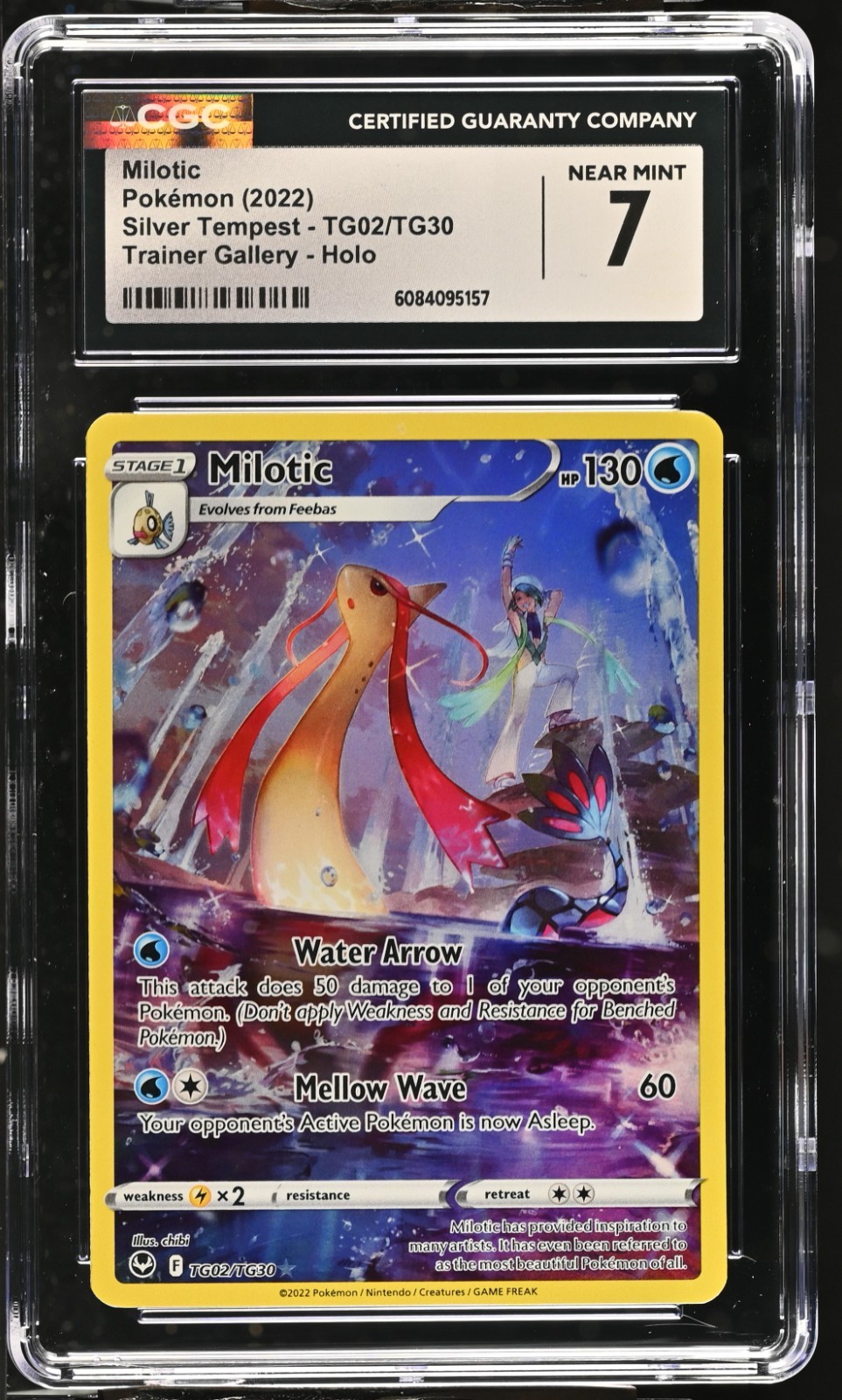 The product is a 2022 Pokemon Silver Tempest Milotic card graded by Certified Guaranty Company (CGC) with a score of 7. This full art Pokemon card features the character Milotic with 130 HP and a holo finish. Manufactured by The Pokemon Company, this English-language card is part of the Pokemon Trading Card Game and is numbered as TG02 in the set. With a population of 241, this collectible card is highly sought after by fans and collectors alike.