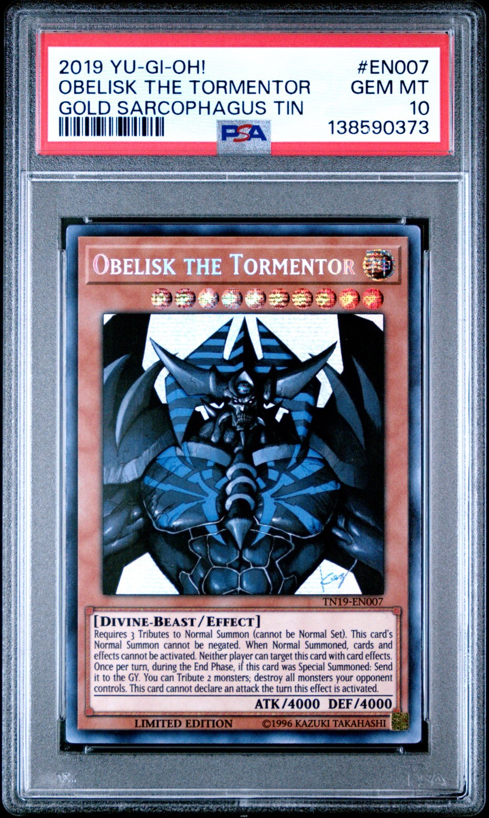 The product is a PSA 10 Obelisk The Tormentor card from the 2019 Gold Sarcophagus Tin set in the Yu-Gi-Oh! TCG. This card features a Divine attribute, Divine-Beast creature type, 4000 defense and attack power, and is a Prismatic Secret Rare limited edition. Manufactured by Konami, this English language card is highly sought after by collectors for its rarity and strong gameplay abilities as an Effect card with a high Level of 10.