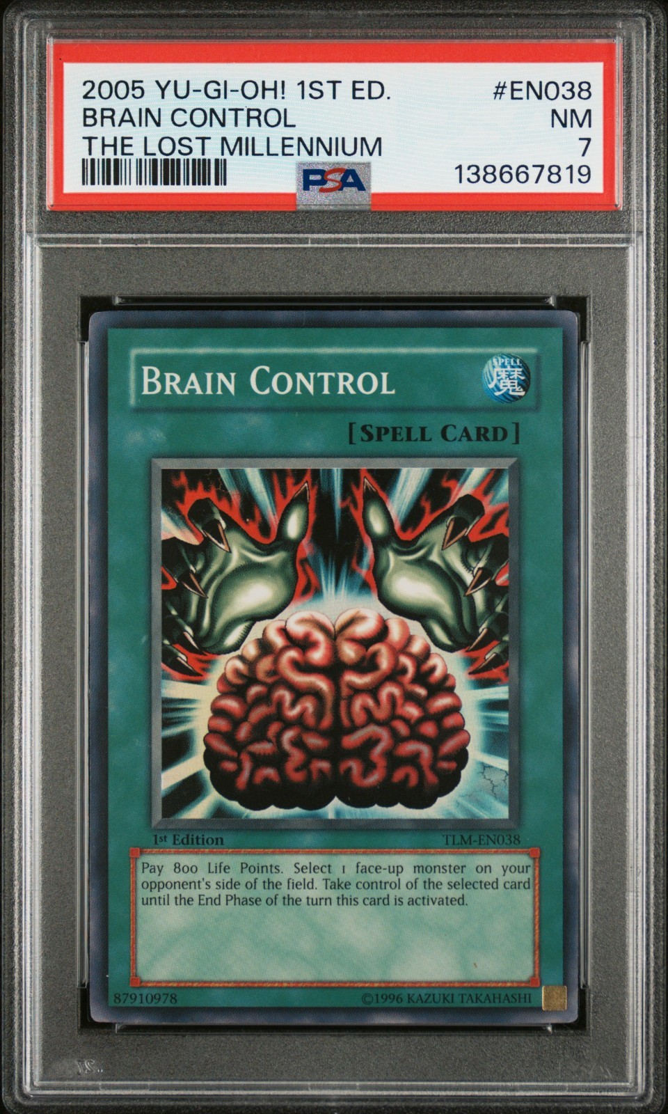 The product is a PSA 7 graded TLM-EN038 Brain Control Ultimate Rare 1st Edition card from the Yu-Gi-Oh! TCG’s The Lost Millennium set, manufactured in 2005 by Konami. This autographed vintage card features the English language and is a valuable collectible for fans of the Yu-Gi-Oh! franchise. Its rarity and first edition status add to its desirability among collectors of collectible card games.
