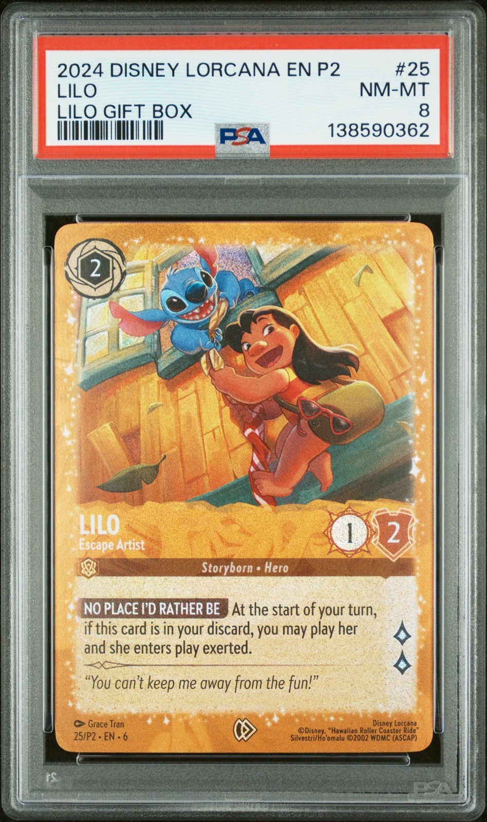 35The product is a 2024 Disney Lorcana promo card featuring the character Lilo as an escape artist. This collectible card game item comes in a special gift box #25 and is part of the Disney Lorcana TCG set. Manufactured by Disney, the English-language card is unique and highly sought after by collectors due to its limited availability and special promotional status.