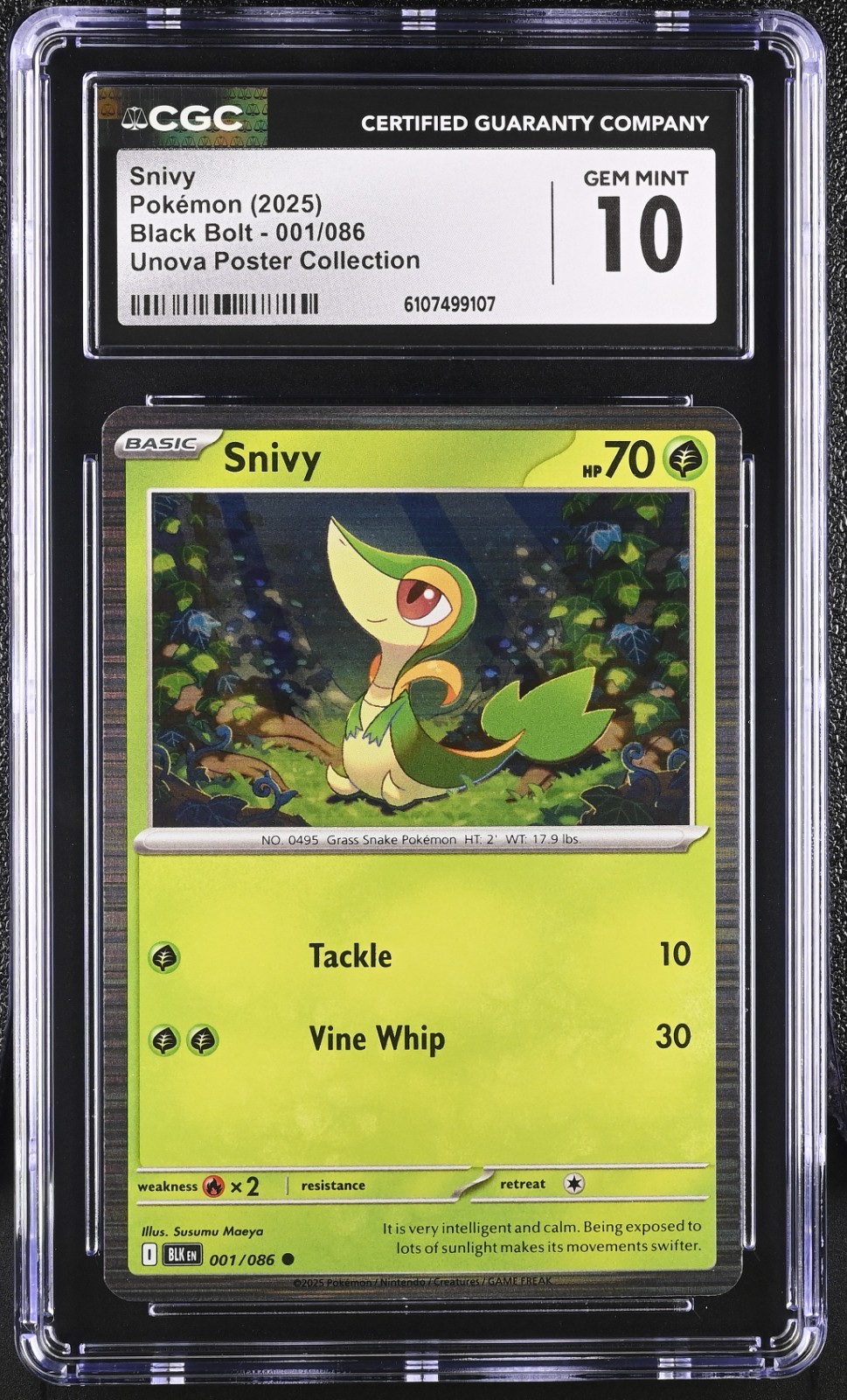 The Snivy 001/086 Sv: Black Bolt CGC 10 card from the Unova Poster Collection is a highly sought after and rare Pokémon Trading Card Game item. Graded a perfect 10 by Certified Guaranty Company (CGC), this English language card features stunning artwork by illustrator Susumu Maeya. With a high HP of 70 and a holo finish, this Basic Pokémon card is a valuable addition to any collector’s stash. The card, released in 2025 by The Pokémon Company, showcases the powerful character Black Bolt in a vibrant and detailed design.