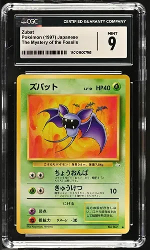 The product is a vintage Japanese Pokémon TCG card featuring Zubat from the Fossil set, with a card number of 41. Manufactured in 1997 by Nintendo, the card is made of standard card stock and has a grass attribute with 40 HP. Illustrated by Kagemaru Himeno, the card is in CGC NM/MINT 9 condition, making it a valuable collectible for fans and collectors of Pokémon cards.